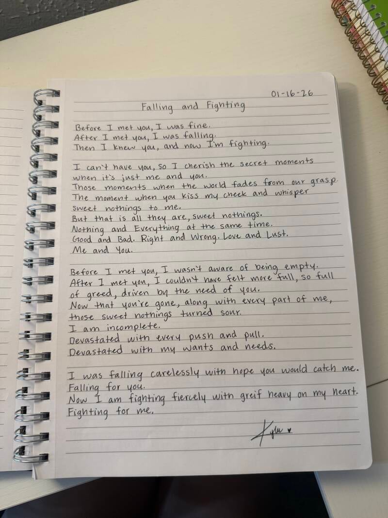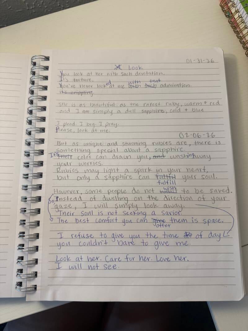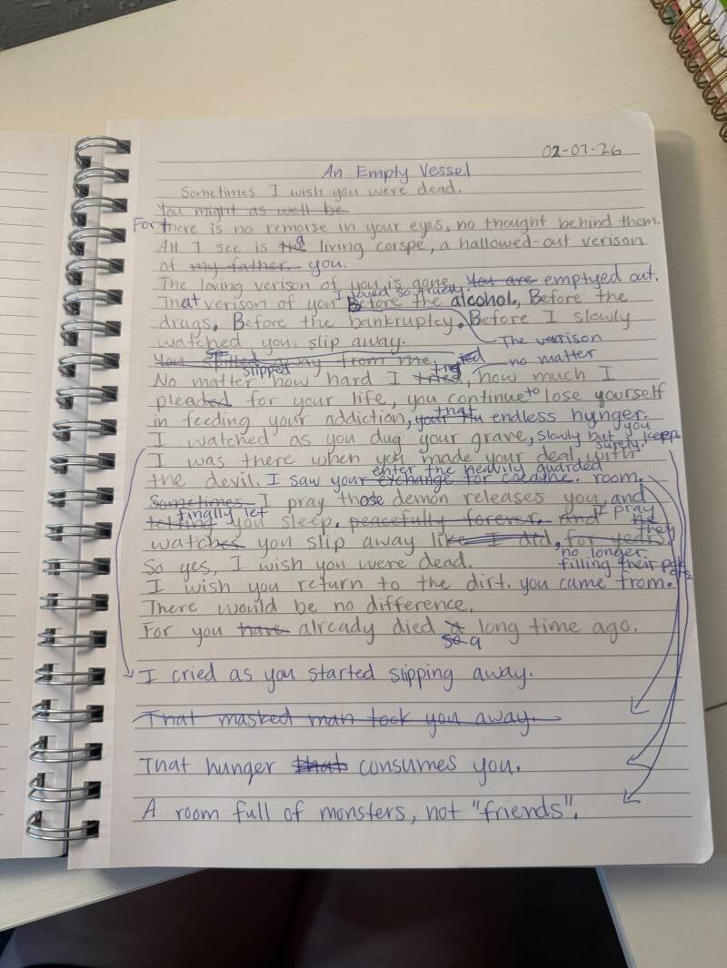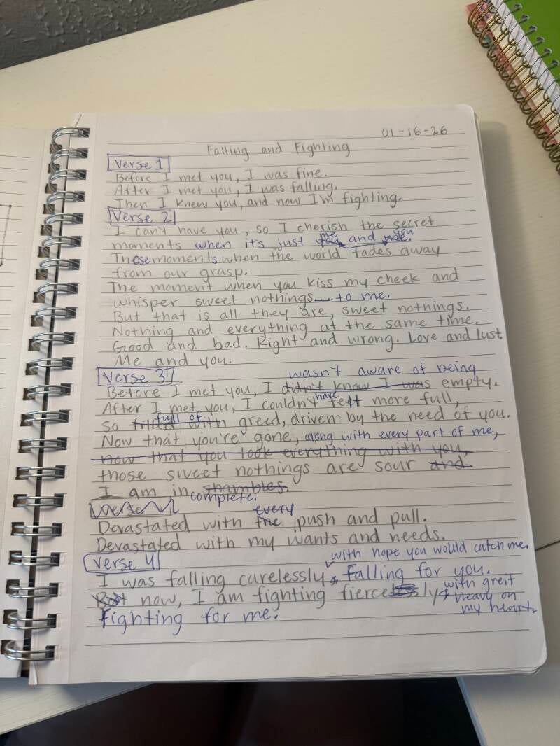 In order to “solve” my research problem (which was the lack of creative writing in schools), I decided to write poems in my free time. I wanted my project to be personal because poetry is oftentimes, if not all the time, personal. And, since poetry is a component of creative writing, I found the perfect solution and did not need that much material for it. All I used for my project was a pencil, a blue pen, a black pen, and pieces of paper. In my process of creating a poem, I start off with writing a rough draft in pencil. This is to just get the layout and theme of what the poem will be about. Then, I use a blue pen to make any edits I see fit, whether that means changing words for rhyming, revising sentences for better flow, or adding/deleting any details for my desired outcome. Once I am satisfied with the edited version of my poem, I re-write it in black pen, and for my final touch, I sign my name at the bottom. I have provided pictures of my progress in writing poems below this section.