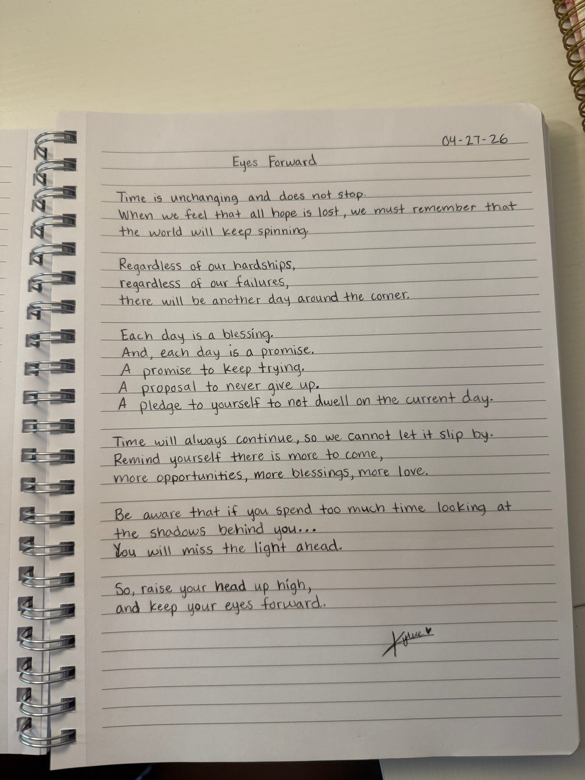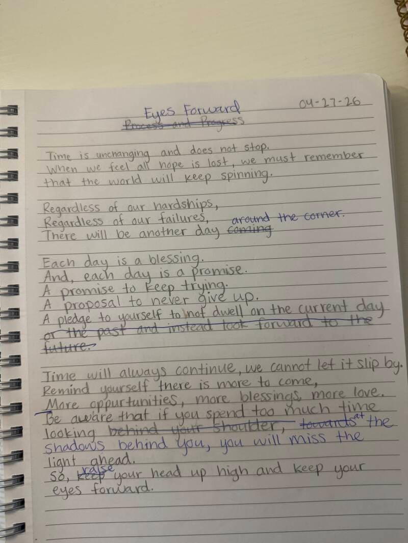 Even though this is the end of my passion project, I will still continue writing poems in my free time. I view poetry as a way of processing my thoughts, feelings, and ideas. This school was very stressful for me, but I realized that by writing poetry, I have managed that stress well. I believe that everyone should have an outlet for themselves when times get rough. It is important to take priority in what one is feeling when those emotions become overwhelming. I know that poetry may not be suitable for everyone, but creative writing comes in many forms. In fact, creative writing is endless and there is no “right or wrong” way to go about it. So, if high school is where poetry and creative writing meet their overall end, then we have the power to bring it back to life, starting with a single piece of paper.
